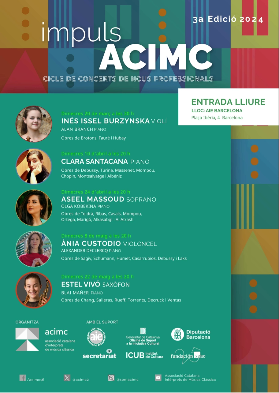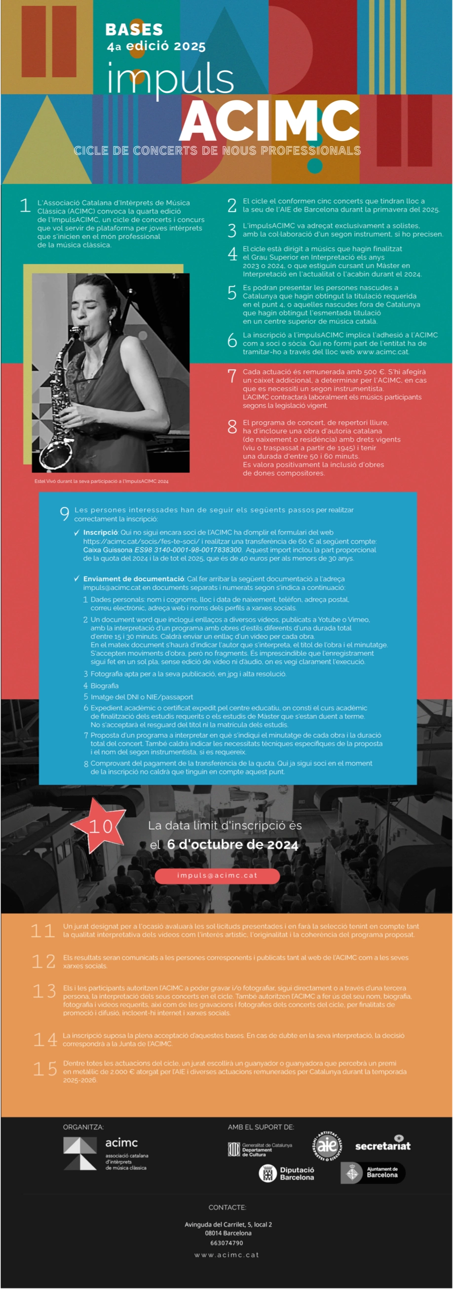18 desembre, 2024Seleccionats els cinc participants per a l'ImpulsACIMC 2025, el cicle-concurs de l'ACIMC que impulsa nous talents musicals amb suport artístic i laboral. -