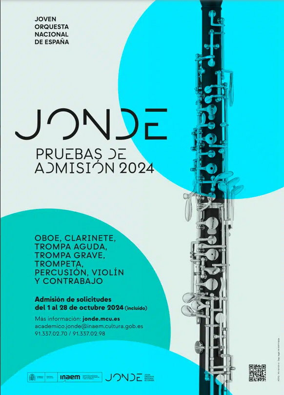 La Jove Orquestra Nacional d’Espanya (JONDE) convoca proves d’admissió de l’1 al 28 d’octubre del 2024 per cobrir la seva Borsa d’Instrumentistes en el període que va des de l’1 de juny del 2025 al 31 de maig del 2027, en les especialitats instrumentals següents: oboè, clarinet, trompa aguda, trompa greu, trompeta, percussió, violí i contrabaix.