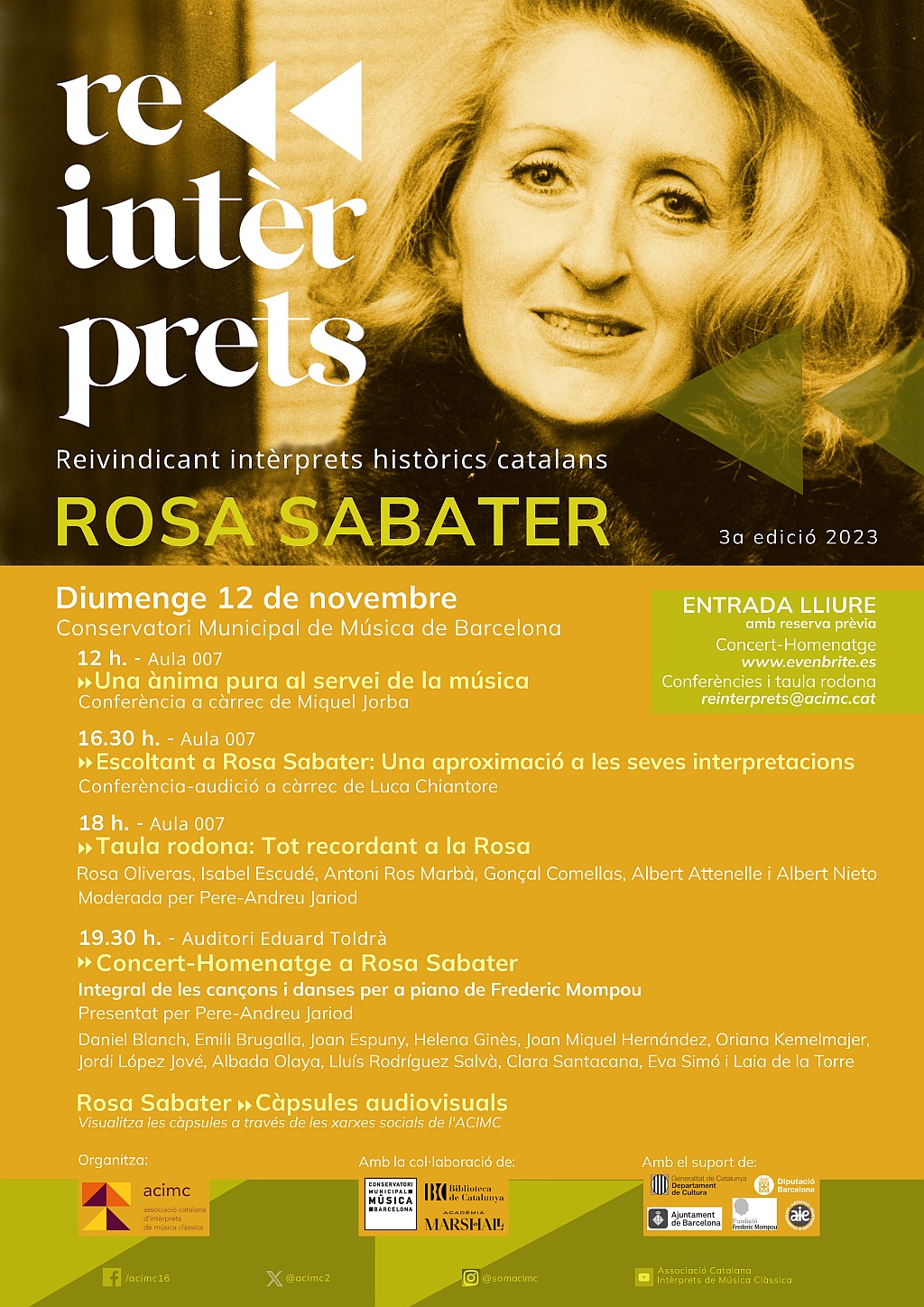 L’Associació Catalana d’Intèrprets de Música Clàssica (ACIMC) presenta la tercera edició del Reintèrprets, iniciativa de divulgació dels grans intèrprets històrics catalans. En aquesta ocasió, l’entitat recordarà la figura de la pianista Rosa Sabater Parera (1927 – 1983), en motiu de 40è aniversari de la seva mort ocorreguda tràgicament el 27 de novembre de 1983 en l’accident d’avió d’Avianca a Mejorada del Campo.